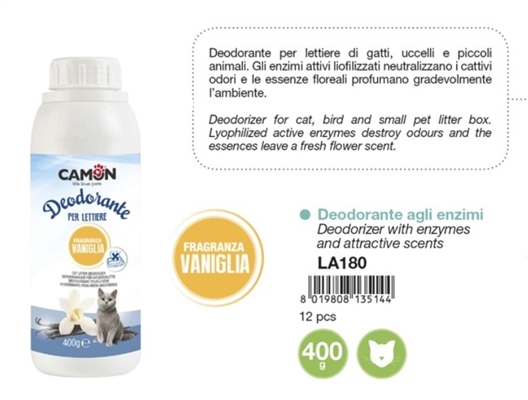 דאודורנט לארגזי חול בניחוח וניל ואנזימים הפתרון האידיאלי לארגזי חול של חתולים, ציפורים וחיות מחמד קטנות. האנזימים שלו מנטרלים ריחות רעים ומשאירים ניחוח עדין ונעים. כך, הארגזי יחזיק מעמד זמן רב יותר. כמות: 400 גרם תוצרת איטליה