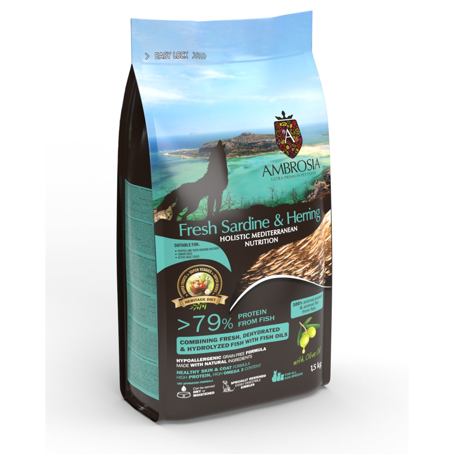 מזון מלא, הוליסטי והיפואלרגני לגורים . כל הגזעים המתכון שלנו של אמברוסיה ים תיכון עם סרדינים והרינג טריים משלב חלבון דגים קל לעיכול המגיע מפילה סרדינים טריים יחד עם הרינג עשיר בחלבון. עם הכמות המושלמת של שמן זית ותערובת של פירות ועשבי תיבול ים-תיכוניים. מרכיבים: סרדינים והרינג טריים דגים 58% (סרדין טרי מוכן 30%, הרינג מיובש 20%, שמן סלמון 5%, חלבון סלמון מפורק 3%), בטטה, אפונה שלמה, שמן קוקוס 4%, עיסת סלק מיובשת, שמן זית, אספסת מיובשת, שורש עולש מיובש (מקור לאינולין ופרוקטו-אוליגוסכרידים; 0.5%). חלבון גולמי: 30% שומן גולמי: 18% חומצות שומן אומגה 3: 2.4% חומצות שומן אומגה 6: 1.4% חומר אנאורגני: 8.9% סיבים גולמיים: 2.8% לחות: 9% סידן: 1.2% זרחן: 0.9%